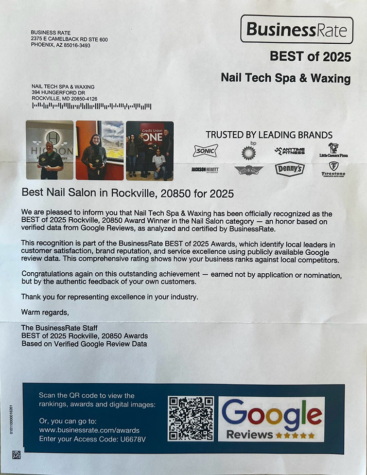 Welcome to Nail Tech Spa & Waxing in 394 Hungerford Dr, Rockville, MD 20850. We are more than just a conventional nail salon.